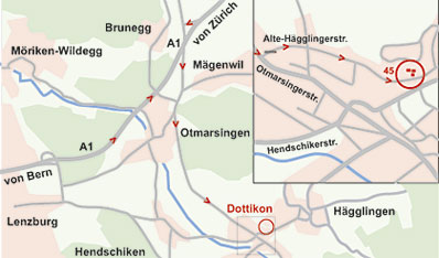Ausfahrt 52, Richtung Mägenwil/Mellingen. Dem Strassenverlauf folgen